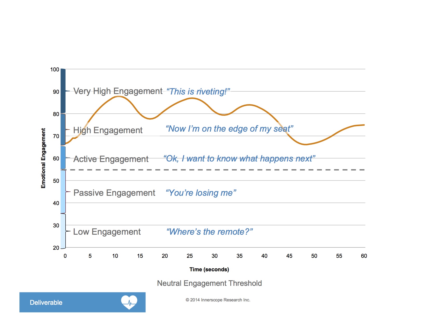 Before diving into the specific results, a little background: Innerscope collects biometric signals from respondents through devices that measure nonconscious biological responses that reflect the respondent’s emotional reactions to the ad. It then aggregates them on a moment-by moment basis throughout the commercial – and plots them graphically in terms of the time scheme using what we call an “engagement trace.” The results are easy to interpret: the higher the levels of Biometric Engagement, the greater the emotional involvement with the stimulus. The client whose ad produces an engagement trace that lingers in the area above 65 and into the 70s has good reason to be pleased.